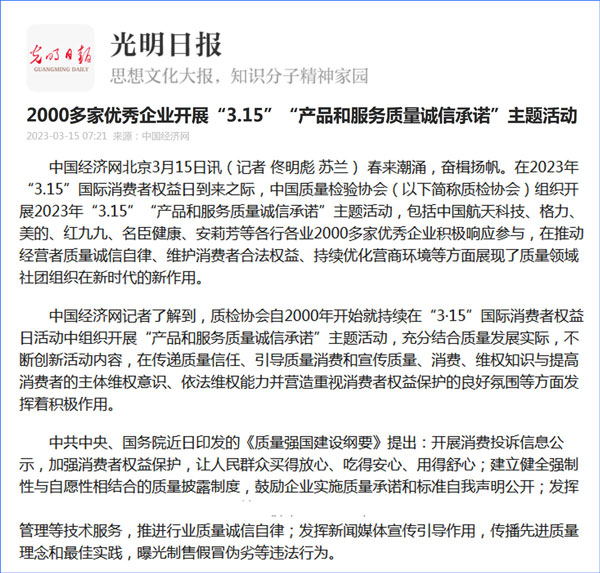 中國質(zhì)量報(bào):凝心聚力譜寫引導(dǎo)質(zhì)量消費(fèi)新篇章——中國質(zhì)檢協(xié)會組織兩千多家企業(yè)開展“產(chǎn)品和服務(wù)質(zhì)量誠信承諾”主題活動