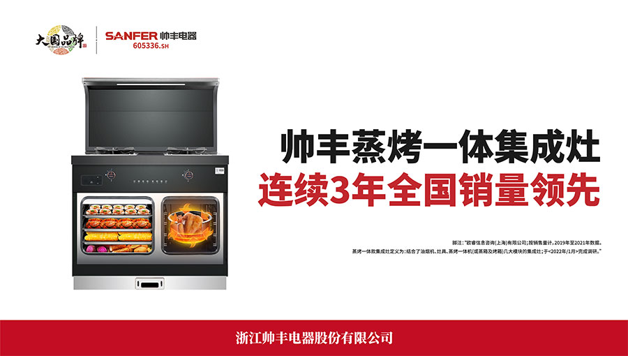 帥豐于2020年10月19日在上交所掛牌敲鑼,成為集成灶板塊首家主板上市企業(yè)。股票簡稱:帥豐電器,股票代碼:605336.SH。在科技創(chuàng)新中,帥豐擁有11項中國發(fā)明專利,177項中國實用新型專利,142項中國外觀設計專利。通過締造有溫度的產(chǎn)品,賦予廚電一體化、集成式的“智慧大腦”。根據(jù)歐睿國際調(diào)研數(shù)據(jù)顯示,帥豐蒸烤一體集成灶2019年、2020年、2021年連續(xù)三年全國銷量領先。