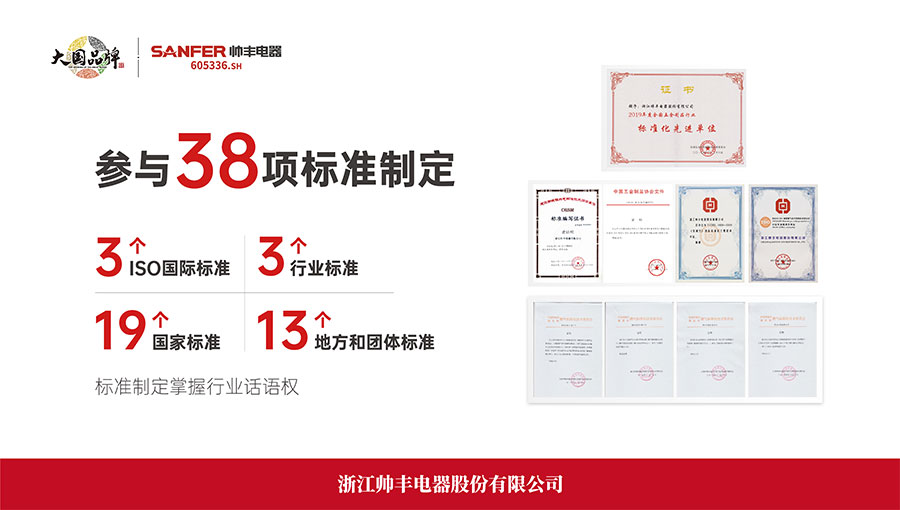 帥豐電器堅持以品質(zhì)為導向,不斷完成“布新、創(chuàng)新、刷新”等突破。持續(xù)以“高端化、科技化、健康化”三大戰(zhàn)略為引擎,擁有“中國合格評定國家認可委員會認可實驗室”,包含燃氣、電氣、噪聲、氣味降低度、油脂分離度、環(huán)境、包裝等多個行業(yè)一流的試驗室,擁有國際國內(nèi)先進的專業(yè)檢測設備,對集成灶產(chǎn)品各項指標進行全方位的檢測,為公司集成灶產(chǎn)品提供了質(zhì)量保障,獲得紹興市人民政府頒發(fā)的“市長質(zhì)量獎”和中國質(zhì)量檢驗協(xié)會頒發(fā)的“全國產(chǎn)品和服務質(zhì)量誠信示范企業(yè)”“全國廚房電器行業(yè)質(zhì)量領先品牌”等榮譽。作為技術(shù)標準和行業(yè)規(guī)范的引領者,帥豐還參與3個ISO國際標準、20個國家標準,4個行業(yè)標準,16個地方團體標準的起草與制定工作。