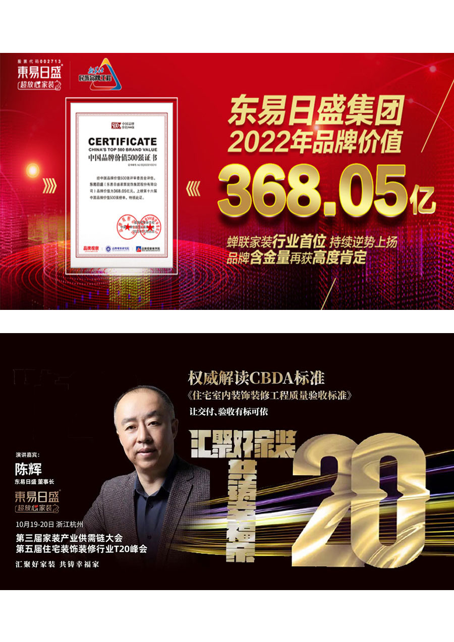東易日盛家居裝飾集團股份有限公司始創(chuàng)于1997年,目前已發(fā)展為一家專業(yè)化、品牌化、數字化、規(guī)模化、產業(yè)化的大型上市家裝集團公司(股票代碼:002713),連續(xù)多年居于《中國最具價值品牌500強》家裝行業(yè)前列,品牌價值高達368.05億元。