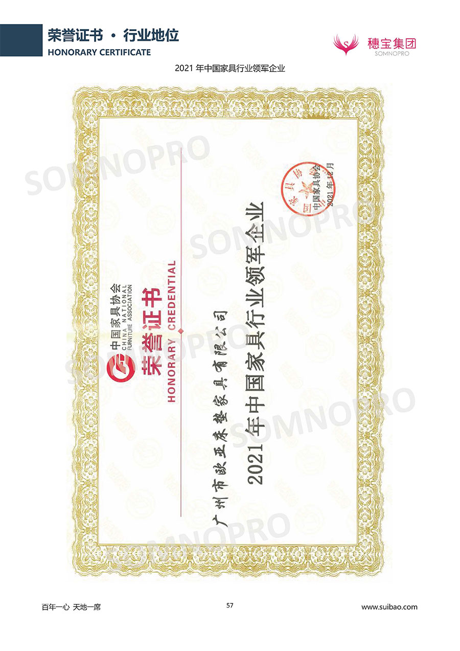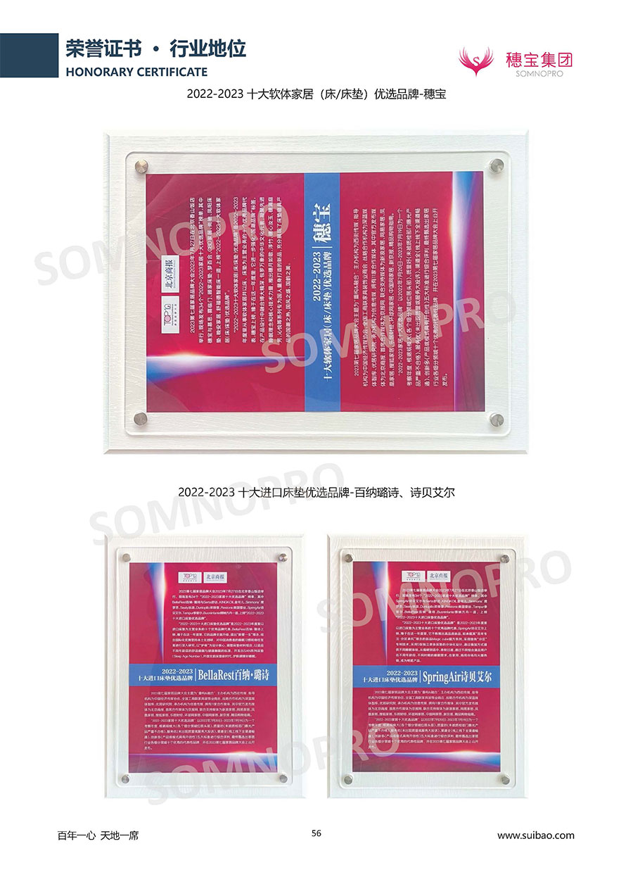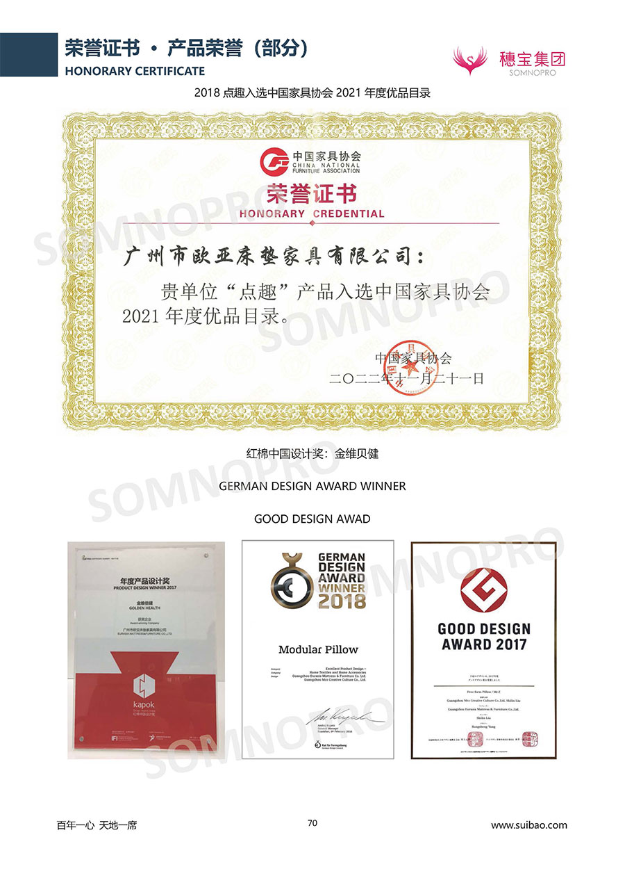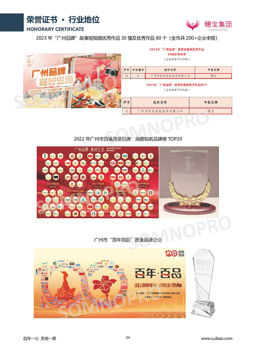 自1971年獨立研發(fā)生產(chǎn)出專屬國人的彈簧床墊,穗寶關(guān)于優(yōu)質(zhì)深度睡眠的研究已有半個世紀(jì)的歷史。穗寶一直專注床墊,專注中國消費者的睡眠研究,針對中國人特點進行優(yōu)化創(chuàng)新,不斷提升國人的睡眠體驗,只為成就每個晚上8小時的優(yōu)質(zhì)深度睡眠。憑借不斷革新的研發(fā)科技和深受消費者信賴的產(chǎn)品品質(zhì),穗寶集團旗下品牌和產(chǎn)品屢獲國內(nèi)外大獎,連續(xù)20年榮膺中國500最具價值品牌,品牌價值高達302.89億元。