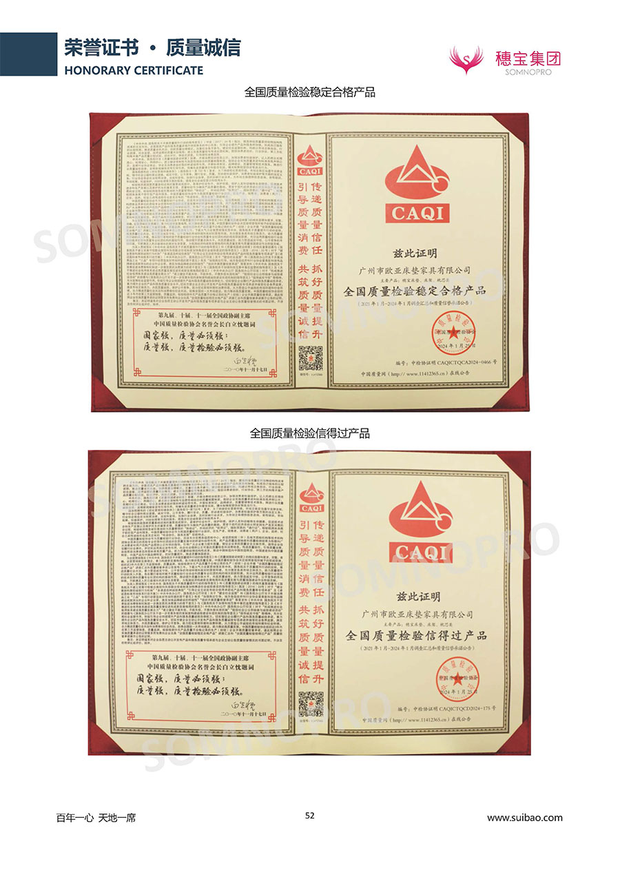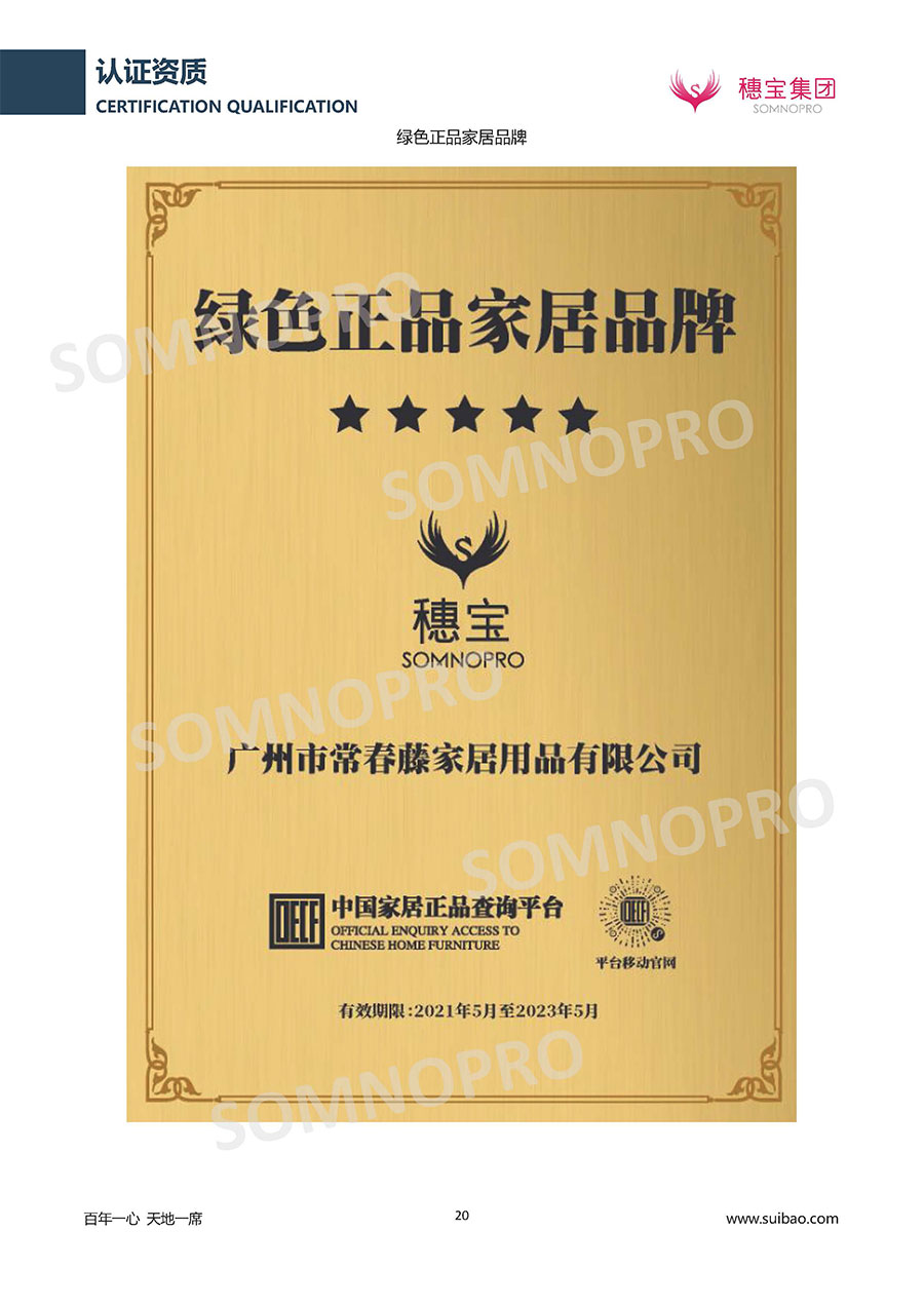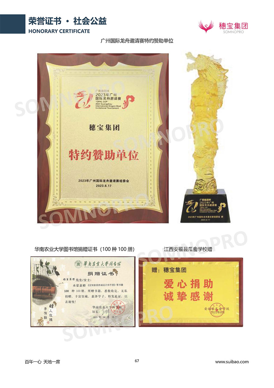 本著高品質(zhì)、高效率、重管理的原則,穗寶已通過ISO9001質(zhì)量管理體系認(rèn)證證書、ISO14001環(huán)境管理體系認(rèn)證證書、ISO45001職業(yè)健康安全管理體系認(rèn)證證書、中國環(huán)境標(biāo)志產(chǎn)品認(rèn)證證書、家居綠色環(huán)保領(lǐng)跑品牌、綠色正品家居品牌、企業(yè)標(biāo)準(zhǔn)“綠色領(lǐng)跑者”證書、CMS測量管理體系證書、CMS測量管理體系證書附件、廣東省“守信用重合同”企業(yè)、廣州歐亞-納稅信用A級納稅人(連續(xù)5年:2018-2022)、2024年中國500最具價值品牌,品牌價值高達302.89億元、廣東高價值商標(biāo)品牌(穗寶)、廣東省重點商標(biāo)保護名錄納入證明、廣州市勞動關(guān)系和諧企業(yè)AA級。穗寶自創(chuàng)立以來,不斷致力于新產(chǎn)品的設(shè)計與研發(fā),多次在國內(nèi)家具展會屢獲獎項,產(chǎn)品暢銷國內(nèi)外,深受客戶一致好評。