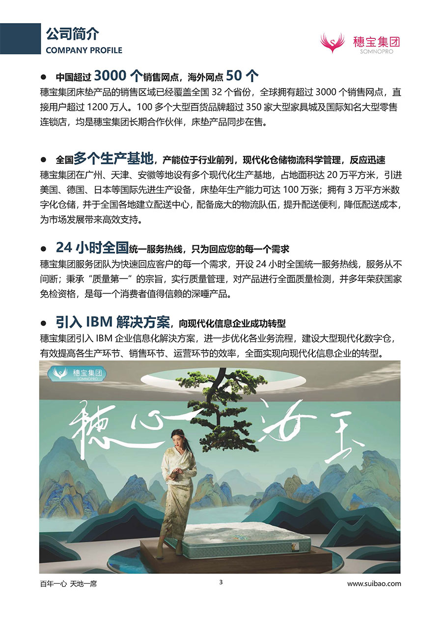 半個世紀(jì)的付出,穗寶集團在深度睡眠領(lǐng)域收獲非凡成就,贏得業(yè)界與社會的一致贊譽。作為大家居行業(yè)的品質(zhì)倡導(dǎo)者,穗寶集團不斷創(chuàng)新,豐富品牌實力,致力推動中國床墊產(chǎn)業(yè)發(fā)展。至今,穗寶集團旗下?lián)碛卸鄠€來自世界各地的優(yōu)質(zhì)品牌,包括:穗寶、詩貝艾爾、百納璐詩、睡客小鎮(zhèn)、Mr.Z早先生等;此外,穗寶集團從世界各地甄選適合不同消費者的優(yōu)質(zhì)睡眠產(chǎn)品,定制屬于您的睡眠空間。如今,穗寶集團形成以研發(fā)、生產(chǎn)和銷售床墊為主營業(yè)務(wù),涉及家具、家居裝飾、酒店配套等多項業(yè)務(wù)的企業(yè)群體。