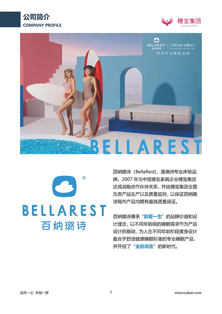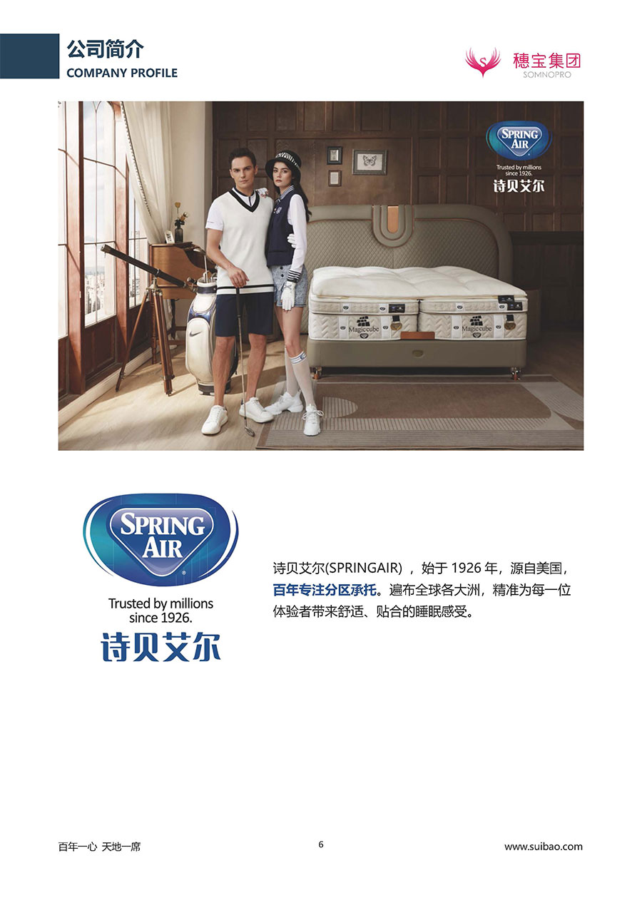 作為大家居行業(yè)的品質(zhì)倡導(dǎo)者,穗寶集團不斷創(chuàng)新,豐富品牌實力,致力推動中國床墊產(chǎn)業(yè)發(fā)展。至今,穗寶集團旗下?lián)碛卸鄠€來自世界各地的優(yōu)質(zhì)品牌,包括:穗寶、詩貝艾爾、百納璐詩、睡客小鎮(zhèn)、Mr.Z早先生等;此外,穗寶集團從世界各地甄選適合不同消費者的優(yōu)質(zhì)睡眠產(chǎn)品,定制屬于您的睡眠空間。如今,穗寶集團形成以研發(fā)、生產(chǎn)和銷售床墊為主營業(yè)務(wù),涉及家具、家居裝飾、酒店配套等多項業(yè)務(wù)的企業(yè)群體。