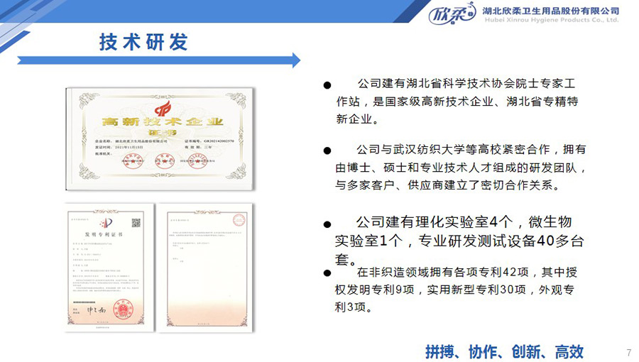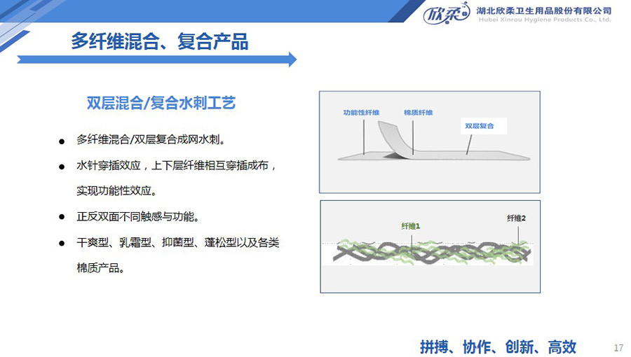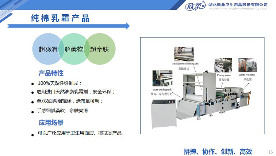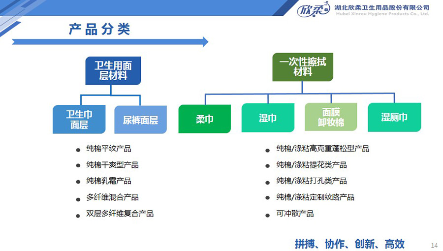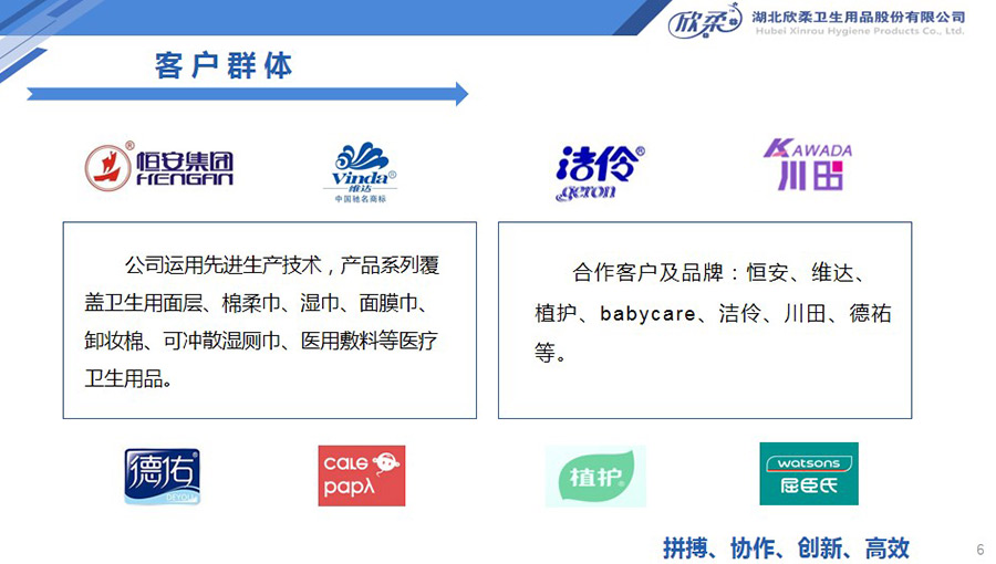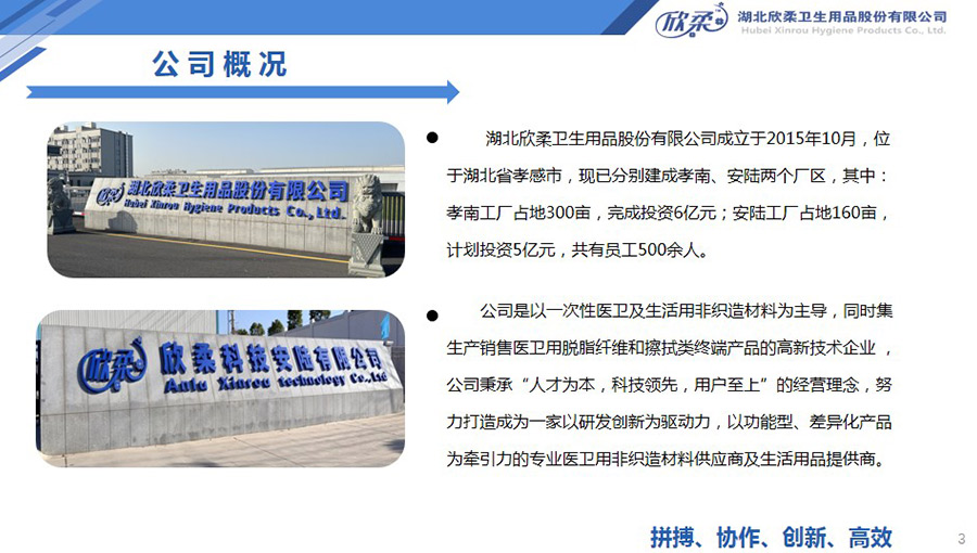 欣柔是以一次性醫(yī)衛(wèi)及生活用非織造材料為主導(dǎo),同時集生產(chǎn)銷售醫(yī)衛(wèi)用脫脂纖維和擦拭類終端產(chǎn)品的高新技術(shù)企業(yè),欣柔秉承“人才為本,科技領(lǐng)先,用戶至上”的經(jīng)營理念,努力打造成為一家以研發(fā)創(chuàng)新為驅(qū)動力,以功能型、差異化產(chǎn)品為牽引力的專業(yè)醫(yī)衛(wèi)用非織造材料供應(yīng)商及生活用品提供商。