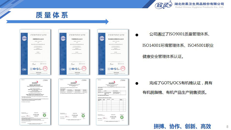 欣柔通過了ISO9001質(zhì)量管理體系、ISO14001環(huán)境管理體系、ISO45001職業(yè)健康安全管理體系認證。完成了GOTS/OCS有機棉認證,具有有機脫脂棉、有機產(chǎn)品生產(chǎn)銷售資質(zhì)。