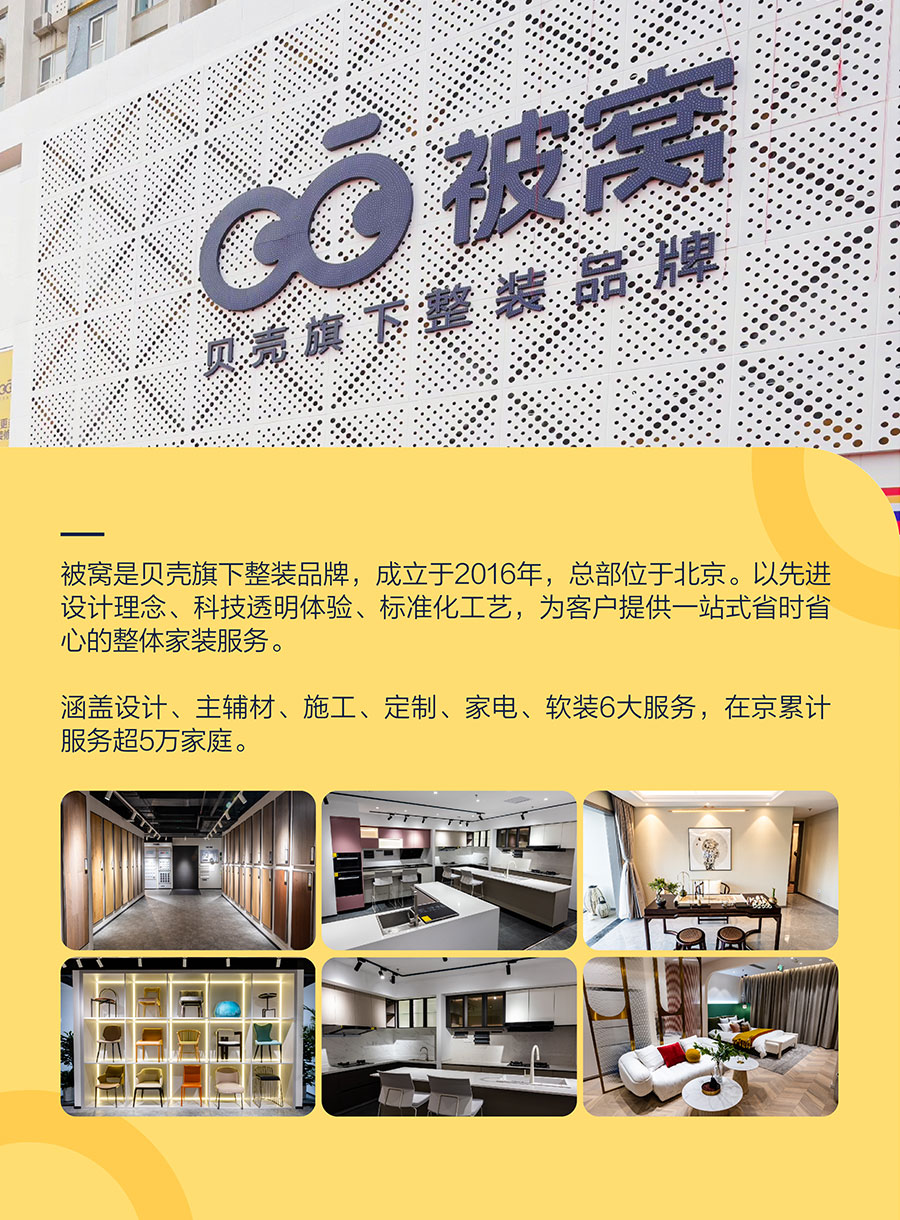 被窩,是貝殼旗下整裝品牌,成立于2016年,總部位于北京。以先進(jìn)設(shè)計(jì)理念、科技透明體驗(yàn)、標(biāo)準(zhǔn)化工藝,為客戶提供一站式省時省心的整體家裝服務(wù)。涵蓋設(shè)計(jì)、主輔材、施工、定制、家電、軟裝6大服務(wù)。