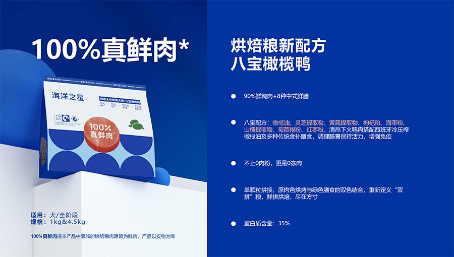 隨著營(yíng)養(yǎng)消費(fèi)逐步升級(jí),海洋之星品牌產(chǎn)品線延展至多肉源、多品類,并正式布局烘焙糧市場(chǎng),以“100%真鮮肉*”重新定義高端烘焙糧品類,為寵主和愛寵提供高品質(zhì)的寵物主糧產(chǎn)品。