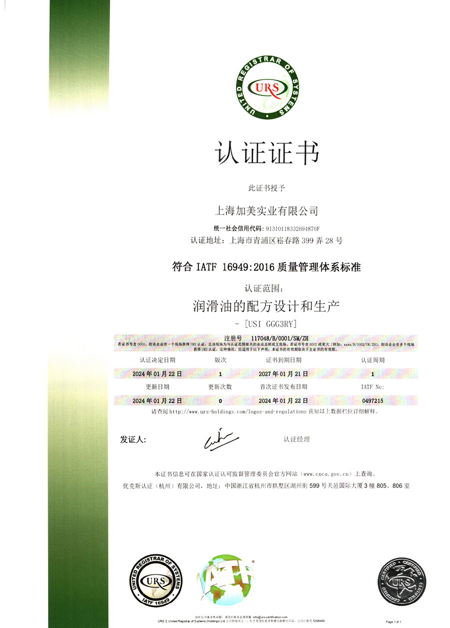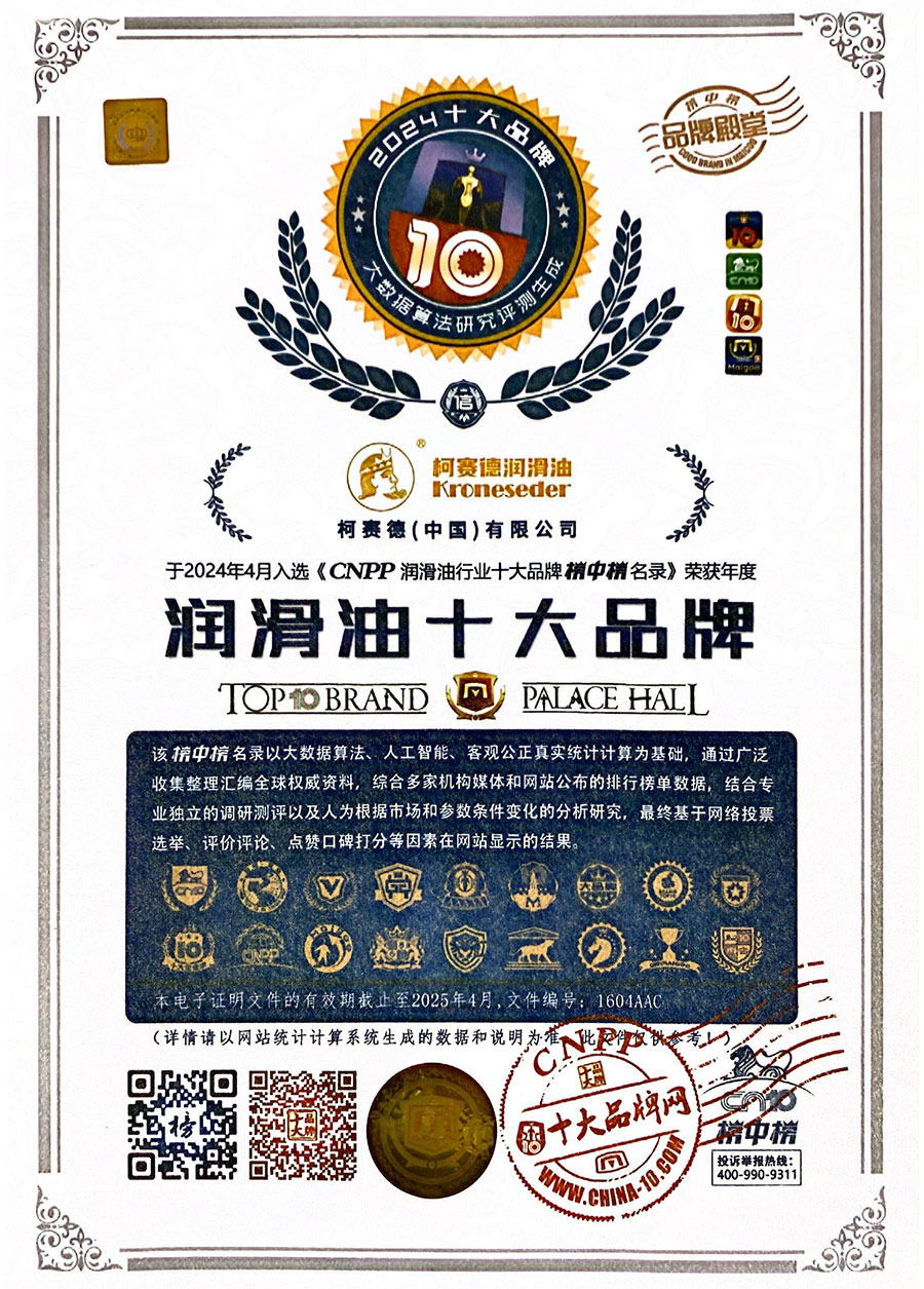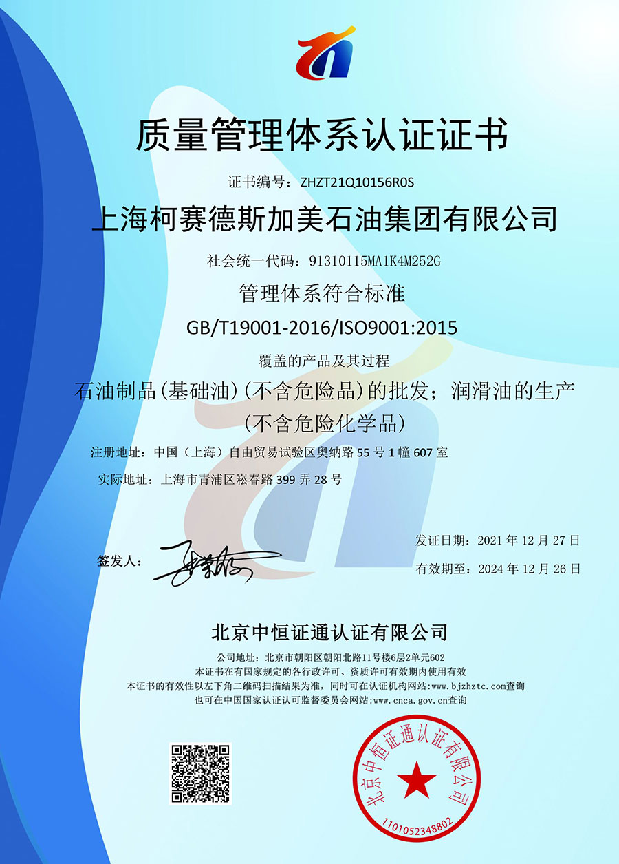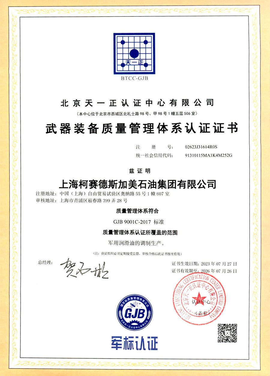 柯賽德斯集團公司統(tǒng)一遵循嚴格的質量保證體系,先后通過了武器裝備質量管理體系認證GJB9001C-2017、ISO/TS16949、IS09001質量體系認證、1S014001環(huán)境體系認證及ISO45001:2018職業(yè)健康安全管理體系認證。隨著業(yè)務領域的不斷擴展,目前柯賽德斯集團公司先后與多家世界能源、化工方面的巨頭建立了產品服務、供應保障、技術合作、技術特別支持單位等方面的戰(zhàn)略合作關系。今天,柯賽德斯集團旗下管理著三大潤滑油品牌,實現(xiàn)了經營上的多元化戰(zhàn)略格局。
