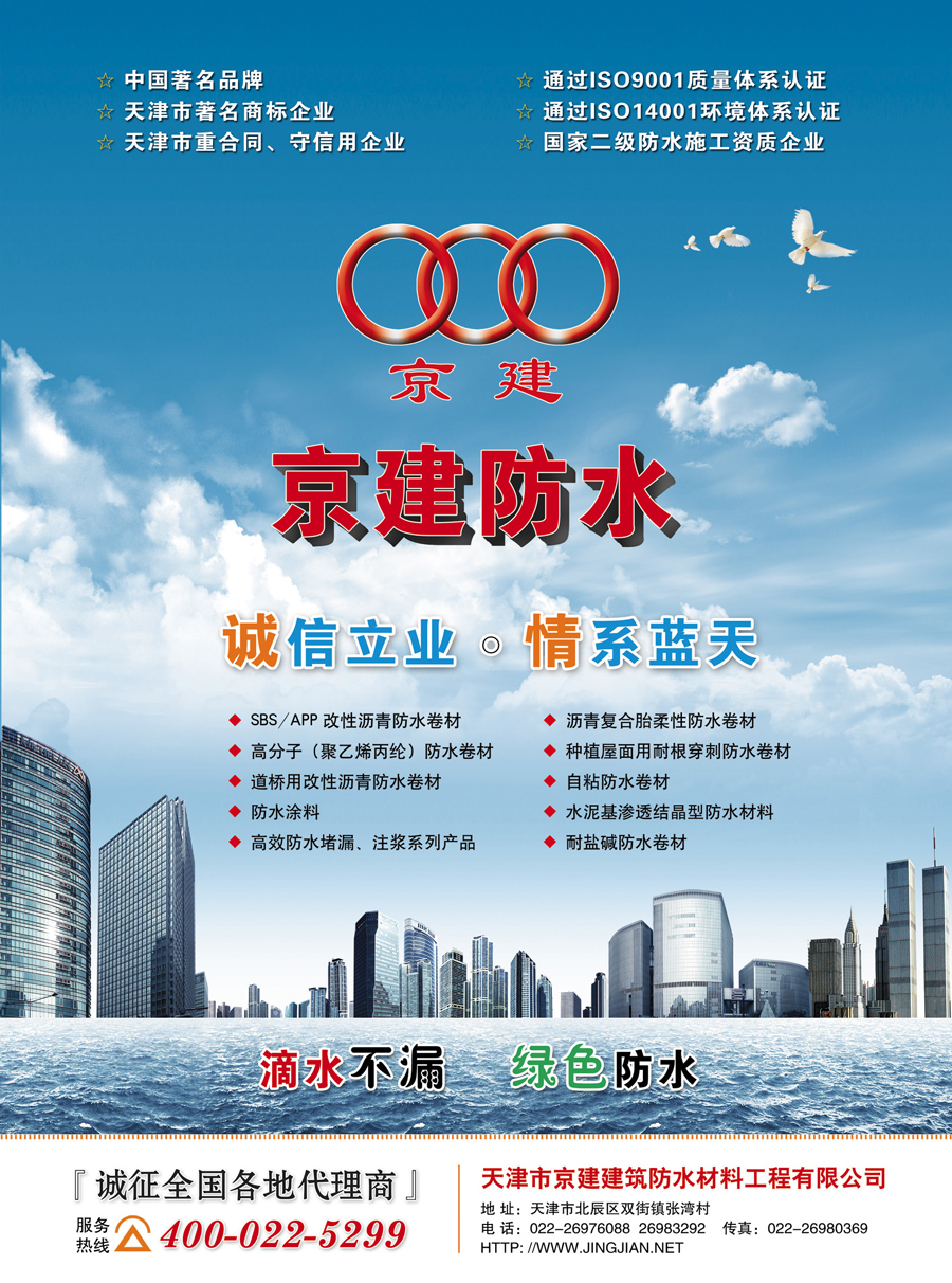 天津市京建建筑防水工程有限公司始建于1996年,隨著公司的逐步成長(zhǎng),目前已成為集新產(chǎn)品研發(fā)、生產(chǎn)、銷售、設(shè)計(jì)、施工、服務(wù)于一體的大型防水企業(yè),公司主導(dǎo)產(chǎn)品有SBS改性瀝青防水卷材、自粘防水卷材、高分子防水卷材、道橋用防水卷材、抗根刺防水卷材、耐鹽堿防水卷材、聚氨酯防水涂料、聚合物水泥防水涂料、丙烯酸防水涂料、道橋用防水涂料、水泥基滲透結(jié)晶型防水材料、聚氨酯密封材料、高效堵漏材料等幾十個(gè)品種。是天津市最大的新型防水材料生產(chǎn)企業(yè)之一,市級(jí)“重合同,守信譽(yù)”單位,系中國(guó)建筑防水材料工業(yè)協(xié)會(huì)會(huì)員單位。天津建材業(yè)協(xié)會(huì)常任理事單位,天津建材服務(wù)中心分支機(jī)構(gòu),公司擁有資產(chǎn)總額8000萬(wàn)元,現(xiàn)有員工385人,中級(jí)以上的工程技術(shù)人員和經(jīng)濟(jì)管理人員126人,公司具有貳級(jí)防水施工資質(zhì)、獲得貳級(jí)以上項(xiàng)目經(jīng)理和建造師32人,高素質(zhì)的員工隊(duì)伍為企業(yè)發(fā)展奠定了基礎(chǔ)。