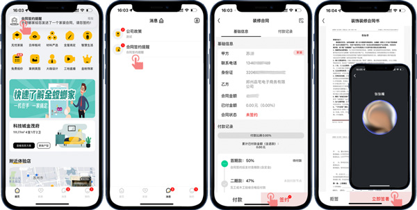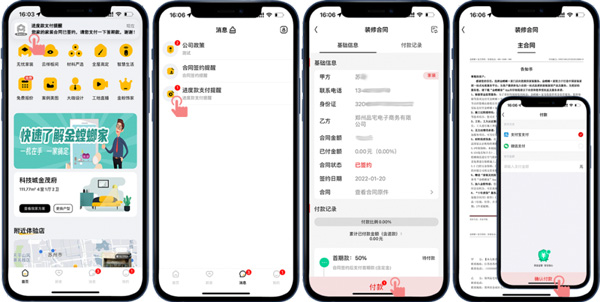 客戶(hù)線(xiàn)上確定好裝修門(mén)店后,門(mén)店會(huì)擬好線(xiàn)上合同,并推送到客戶(hù)的APP賬號(hào),客戶(hù)收到合同簽約提醒就可以在線(xiàn)簽約操作了,合同簽好后通過(guò)進(jìn)度款支付提醒可以進(jìn)行在線(xiàn)付款操作。
