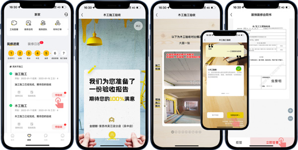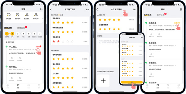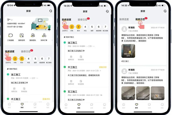 通過(guò)“新家-裝修進(jìn)度”和“新家-裝修日志”模式,直觀地了解到目前的裝修階段,工程隊(duì)每日的工作內(nèi)容,讓客戶(hù)在家就能了解施工進(jìn)度、感受工程品質(zhì)!