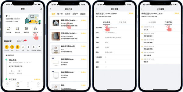 此外,也能在“新家-材料訂單”查看裝修涉及到的材料采購(gòu)和到貨情況,省去客戶(hù)去現(xiàn)場(chǎng)查看的麻煩,如果材料未按約定時(shí)間到貨,客戶(hù)也能及時(shí)跟催門(mén)店處理,以免耽誤裝修進(jìn)度。
