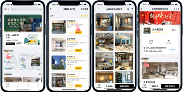 目前,金螳螂家在全國(guó)擁有150家門(mén)店,客戶(hù)可以通過(guò)“附近體驗(yàn)店”選擇客戶(hù)所在城市的服務(wù)門(mén)店,在這里可以了解到該門(mén)店的720度VR全景樣板間、案例、設(shè)計(jì)師以及客戶(hù)的真實(shí)評(píng)價(jià),不用出門(mén)探訪(fǎng)實(shí)體門(mén)店,就能快速了解門(mén)店情況,省時(shí)又省力!