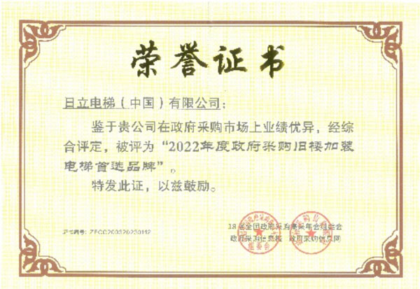 日立電梯獲得2022年度政府采購(gòu)電梯首選品牌、政府采購(gòu)舊樓加裝電梯首選品牌