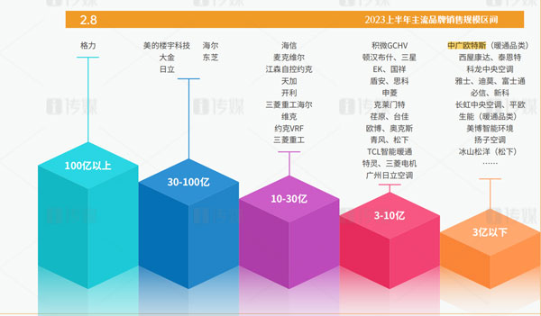 作為“熱泵行業(yè)領(lǐng)軍品牌”的中廣歐特斯,從2018年起逐步轉(zhuǎn)型向暖通與舒適家居領(lǐng)域滲透。經(jīng)過多年積累,中廣歐特斯在2023年上半年依然保持著逆勢(shì)而上的發(fā)展優(yōu)勢(shì),在主流品牌3億以下銷售規(guī)模中占據(jù)頭部位置。