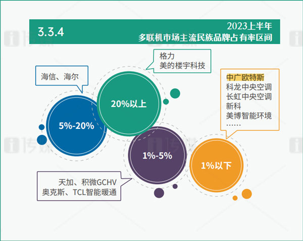 作為中央空調(diào)市場(chǎng)的絕對(duì)權(quán)重品類,多聯(lián)機(jī)一直以來都能以一己之力決定行業(yè)的風(fēng)向,而2023上半年,多聯(lián)機(jī)市場(chǎng)的走勢(shì)與行業(yè)大勢(shì)卻呈現(xiàn)相悖的局面,下滑4.2%。其下滑走勢(shì)的原因與房產(chǎn)經(jīng)濟(jì)走勢(shì)緊密相關(guān)。在品牌陣營上,國產(chǎn)陣營、歐美陣營以及日韓陣營組成了中國中央空調(diào)行業(yè)的三大陣容,且愈發(fā)穩(wěn)固。其中,國產(chǎn)陣營穩(wěn)穩(wěn)占據(jù)著超過一半的市場(chǎng)份額,擁有后發(fā)優(yōu)勢(shì)的中廣歐特斯通過兩年時(shí)間的沖刺,已在其中占有一席之地。