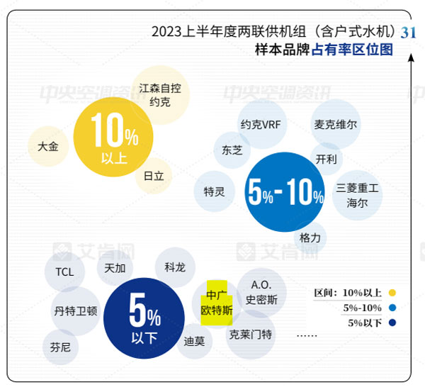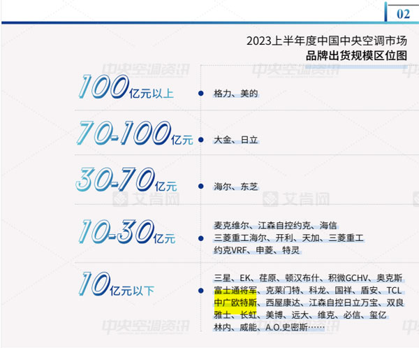 經(jīng)過多年的發(fā)展,中國中央空調(diào)市場(chǎng)的品牌格局基本穩(wěn)定。結(jié)合2023上半年各品牌的市場(chǎng)表現(xiàn),該報(bào)告將品牌出貨規(guī)模區(qū)位分為5大陣營,其中,中廣歐特斯在10億元以下規(guī)模榜上有名。