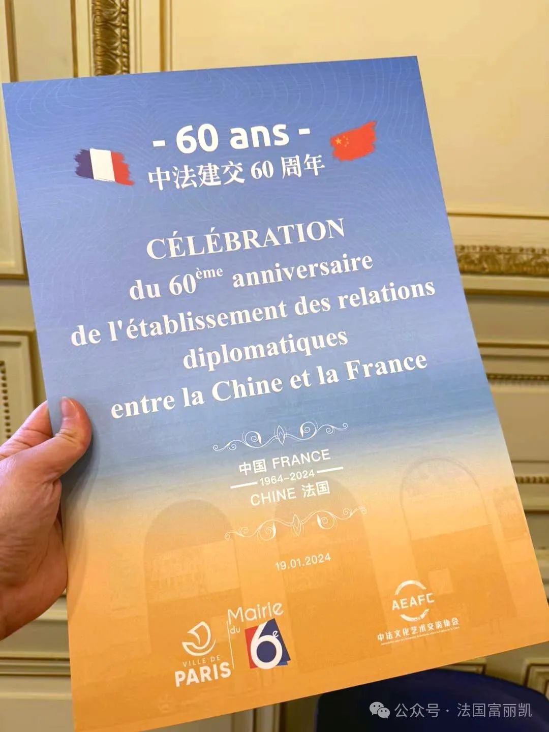 1月27日是中法建交60周年紀(jì)念日,日前由中法文化藝術(shù)交流協(xié)會(AEAFC)主辦的慶祝中法建交60周年文藝演出在巴黎6區(qū)政府禮堂舉行。巴黎6區(qū)政府、中國駐法使館等相關(guān)政府工作人員、歐洲時(shí)報(bào)、全球公益聯(lián)盟等組織負(fù)責(zé)人等出席活動,共話新時(shí)期大國友誼的現(xiàn)實(shí)意義及長遠(yuǎn)影響。60周年、巴黎6區(qū),也寄寓著對中法交往六六大順的期盼。