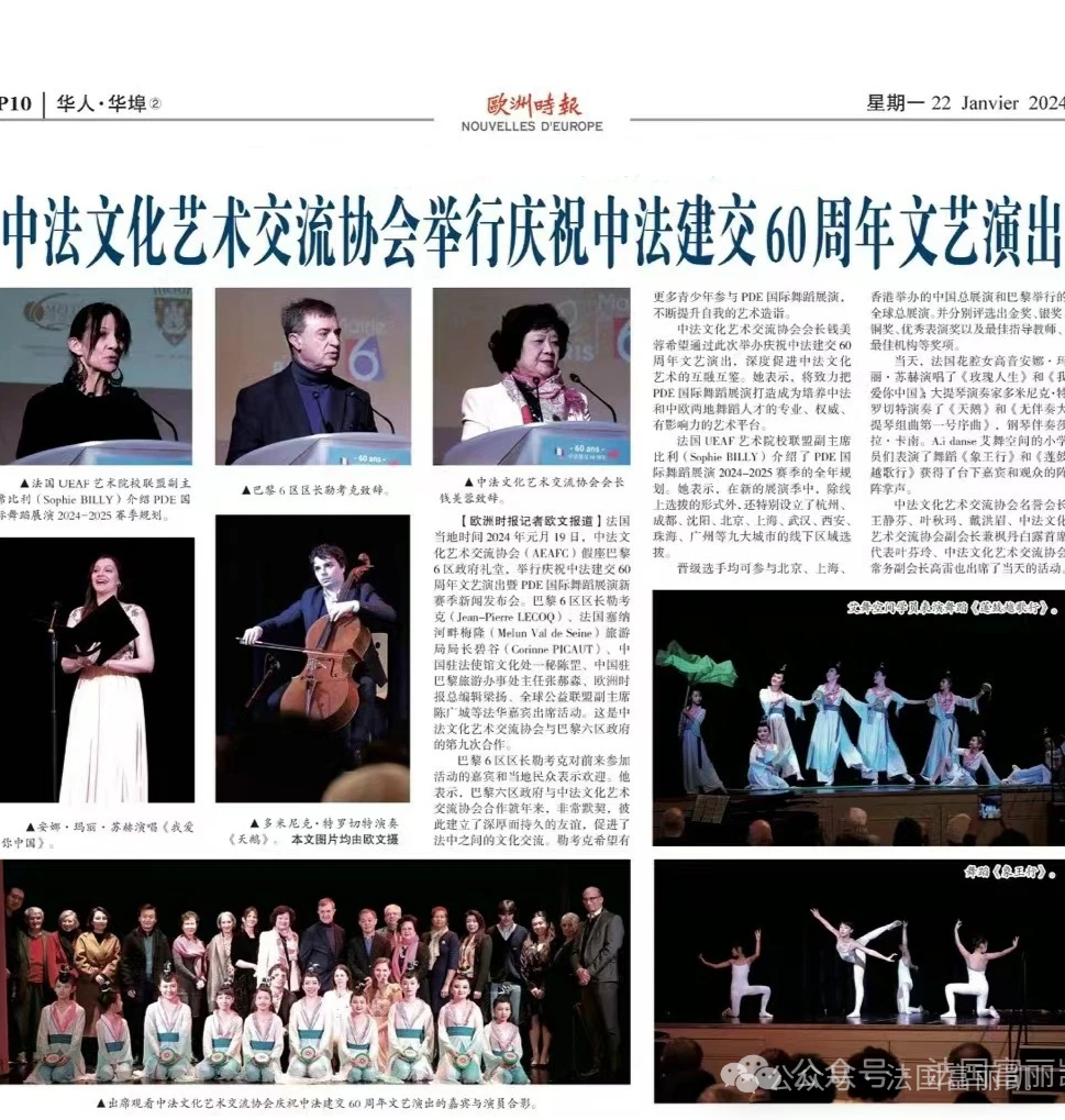 1月22日,巴黎當(dāng)?shù)刂形拿襟w《歐洲時(shí)報(bào)》對中法文化藝術(shù)交流協(xié)會慶祝中法建交60周年活動的報(bào)道,刊登了法國富麗凱參加活動的照片。