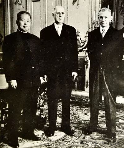 左為中國首任駐法大使黃鎮(zhèn),中為時(shí)任法國總統(tǒng)戴高樂將軍。