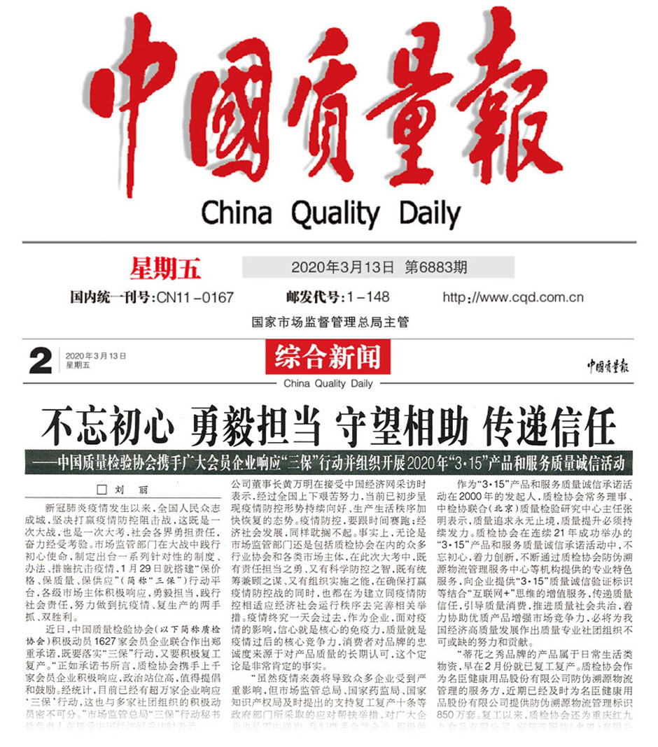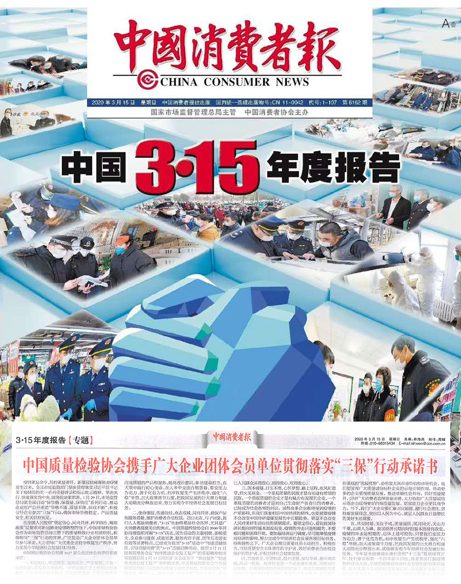 中國(guó)質(zhì)量報(bào)《不忘初心 勇毅擔(dān)當(dāng) 守望相助 傳遞信任——中國(guó)質(zhì)量檢驗(yàn)協(xié)會(huì)攜手廣大會(huì)員企業(yè)響應(yīng)“三?!毙袆?dòng)并組織開展2020年“3·15”產(chǎn)品和服務(wù)質(zhì)量誠(chéng)信活動(dòng)》