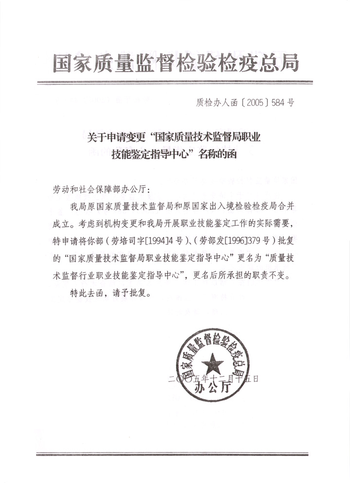 關(guān)于申請(qǐng)變更“國家質(zhì)量技術(shù)監(jiān)督局職業(yè)技能鑒定指導(dǎo)中心”名稱的函
