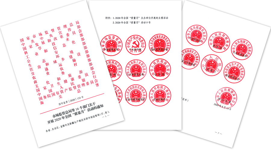 市場監(jiān)管總局、中央宣傳部、國家發(fā)展改革委、科技部、工業(yè)和信息化部等2020年全國“質(zhì)量月”活動主辦單位在《市場監(jiān)管總局等16個部門關(guān)于開展2020年全國“質(zhì)量月”活動的通知》(國市監(jiān)質(zhì)〔2020〕133號)中明確指出:為深入學(xué)習(xí)貫徹習(xí)近平新時代中國特色社會主義思想和黨的十九大精神,認(rèn)真落實(shí)黨中央、國務(wù)院關(guān)于質(zhì)量工作的重大決策部署,做好“六穩(wěn)”工作、落實(shí)“六保”任務(wù),切實(shí)維護(hù)市場秩序,著力優(yōu)化營商環(huán)境,全面提升產(chǎn)品、工程和服務(wù)質(zhì)量,為建設(shè)質(zhì)量強(qiáng)國、決勝全面建成小康社會提供有力支撐,市場監(jiān)管總局等16個部門定于2020年9月聯(lián)合開展全國“質(zhì)量月”活動。